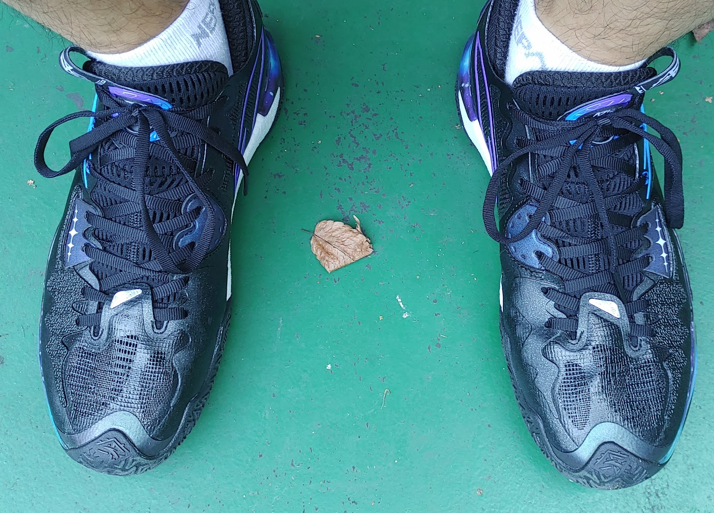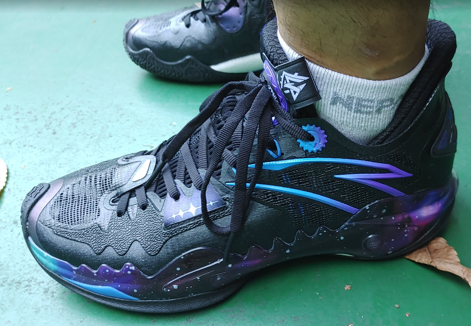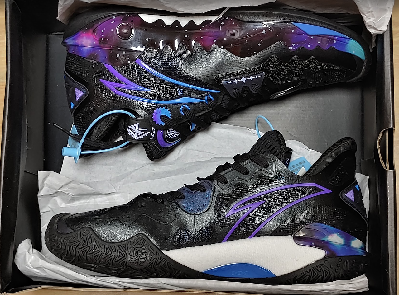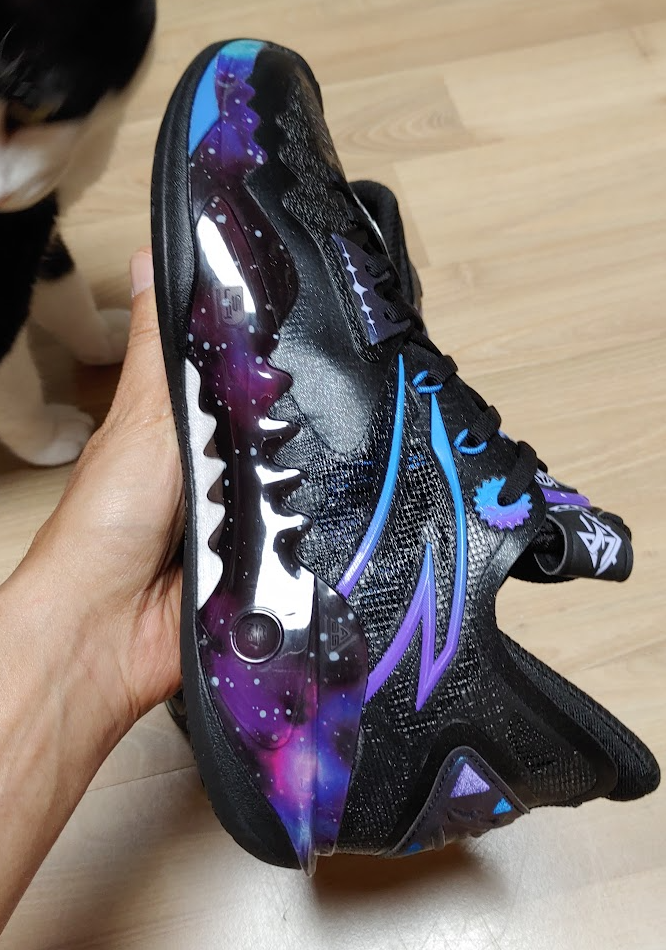 마치 잘 빠진 축구화를 보는 듯한... 반짝이 컨셉 특히 보라색 겔럭시 무늬? 지지대가 바깥쪽에 위치해 있다.