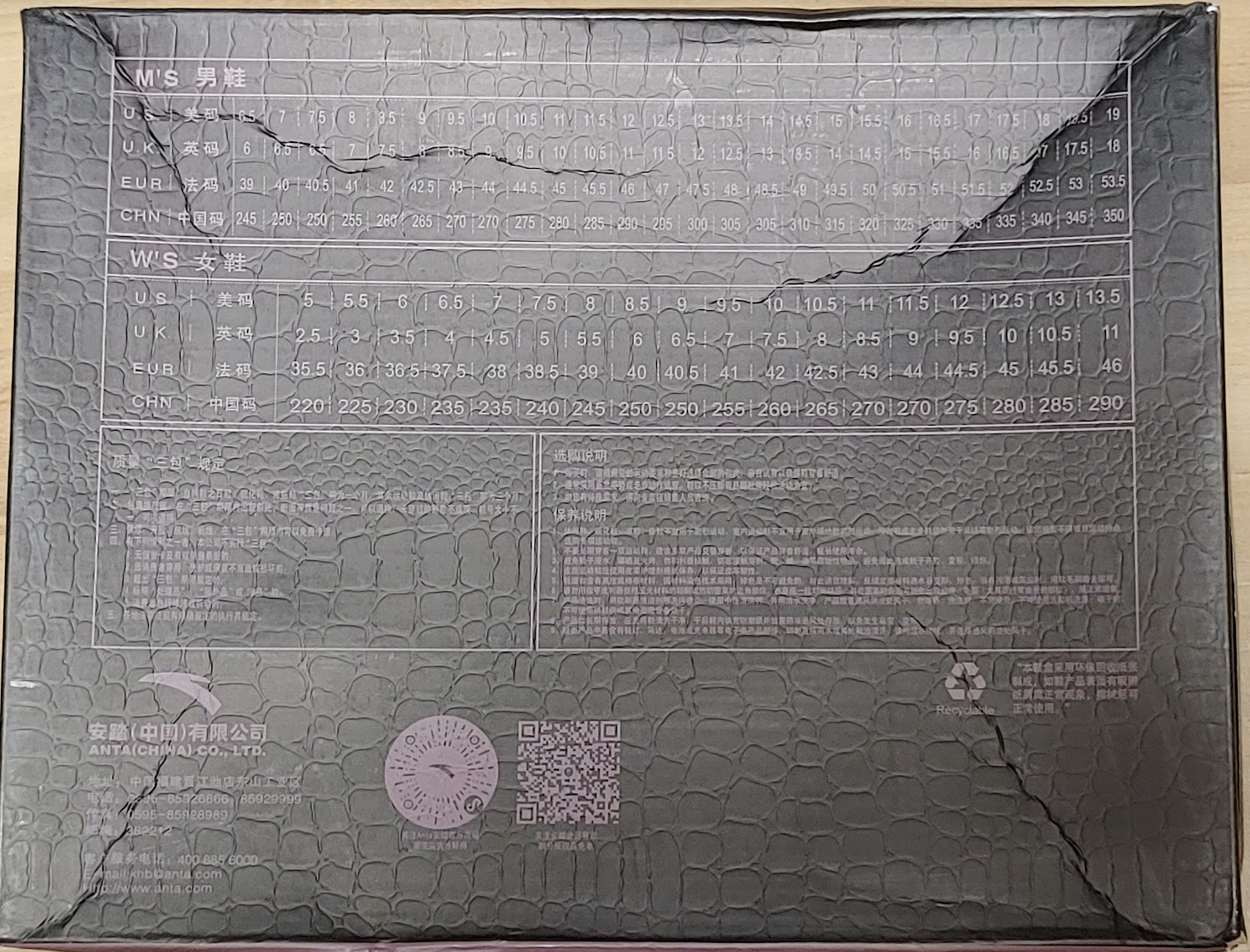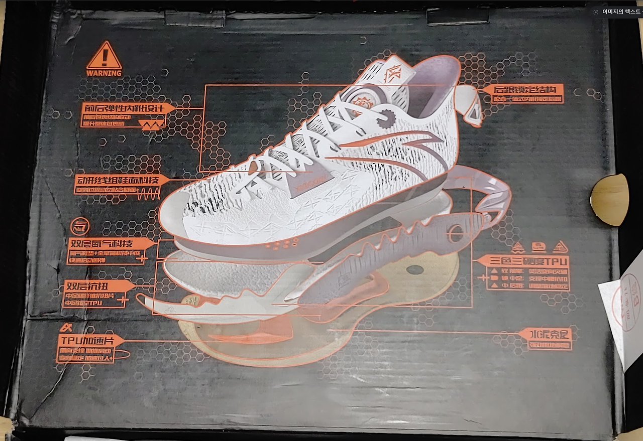 박스 뒤에는 사이즈 표 - 중국 사이즈 mm 표기에 5mm 더하면 한국 사이즈이다. 중국 260 -> 한국 265mm