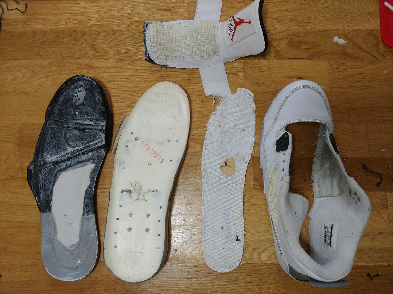 에어는 앞축과 뒷축에 자리잡고 있었다. 중창에 매몰되어 있어서 도저히 도려내지 못했다. 그래서 반을 가르기로...