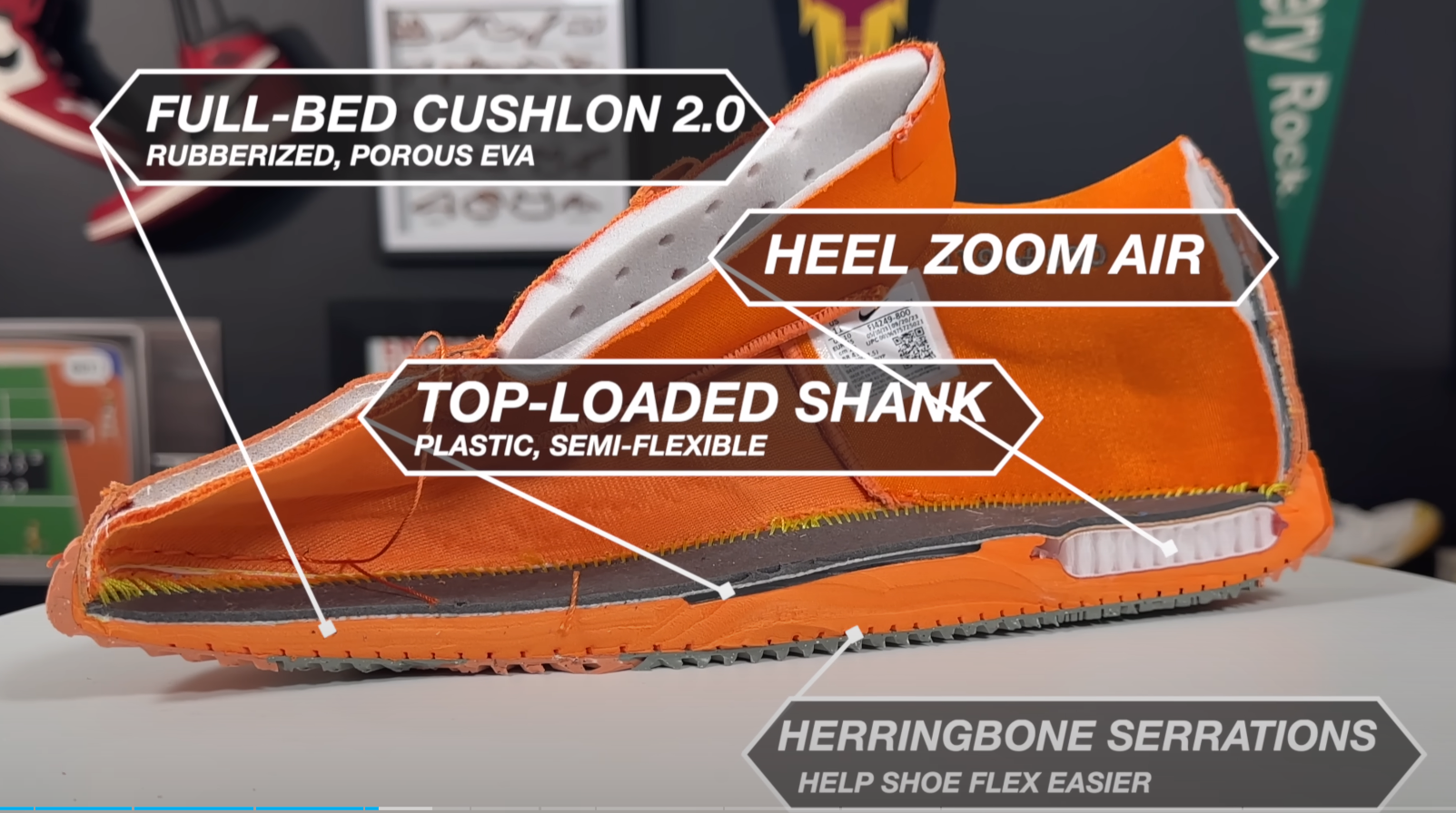 아웃솔 자체가 청어가시 형태라 이런 패턴은 점점 더 신발을 잘 구부러지게 하고 유연해지는 지면에 딱 붙을 수 있게 한다고 말하고 있습니다.